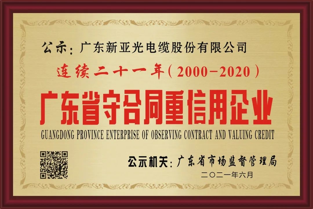 熱烈祝賀新亞電纜連續二十一年獲評“廣東省守合同重信用企業”榮譽