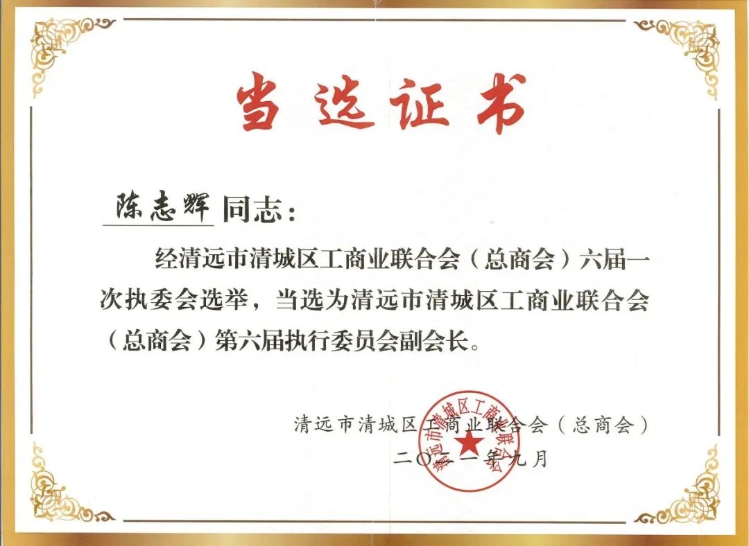 熱烈祝賀我司總經(jīng)理陳志輝當選第六屆清城區(qū)工商聯(lián)副會長