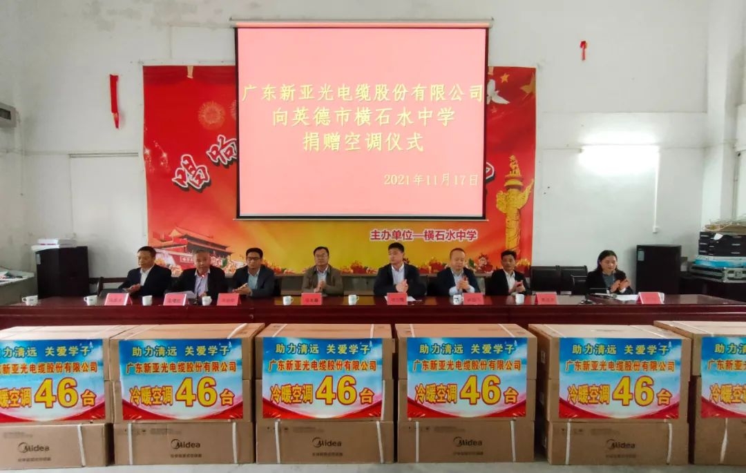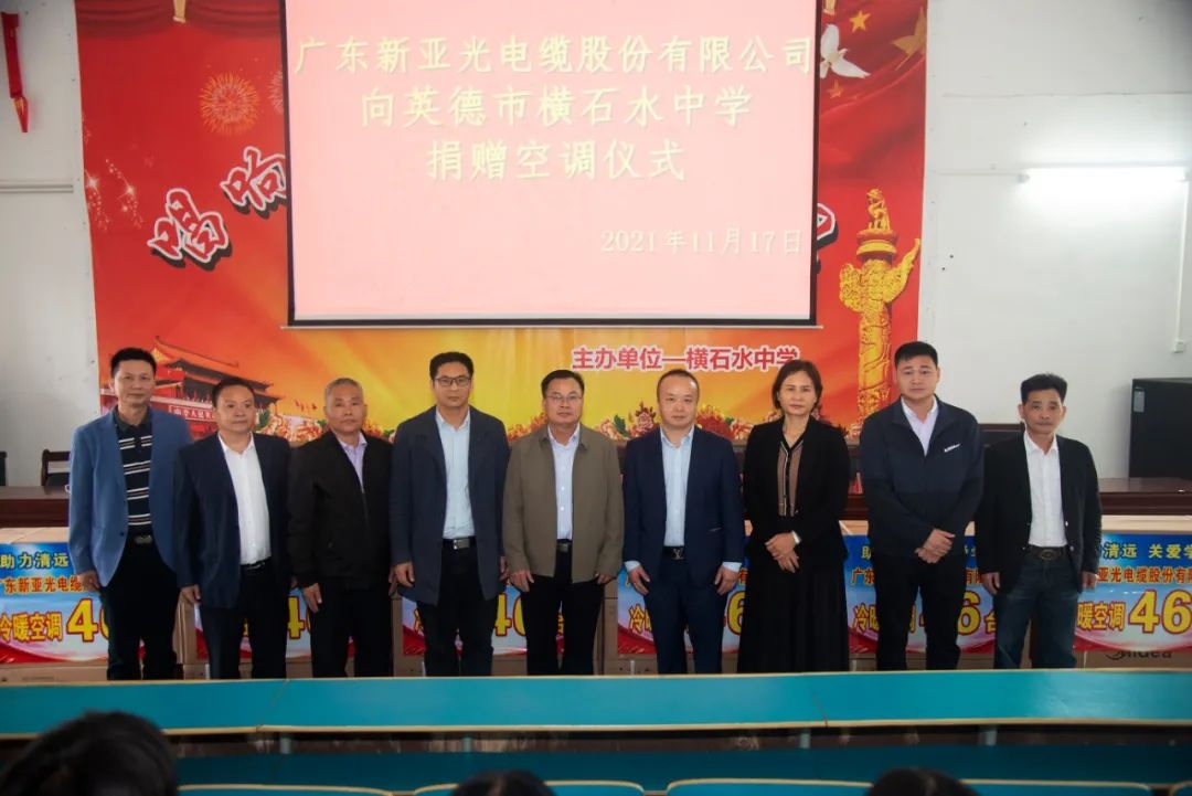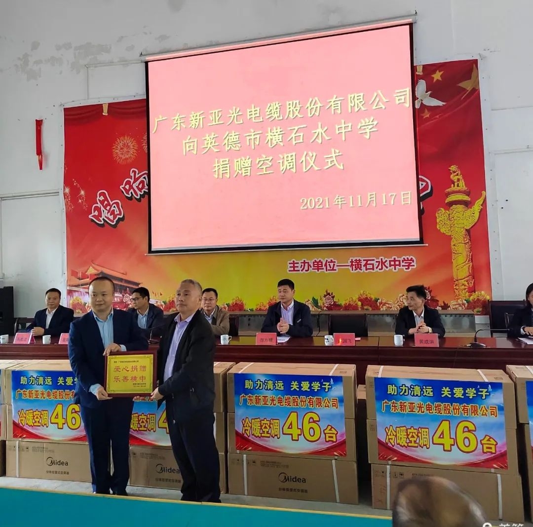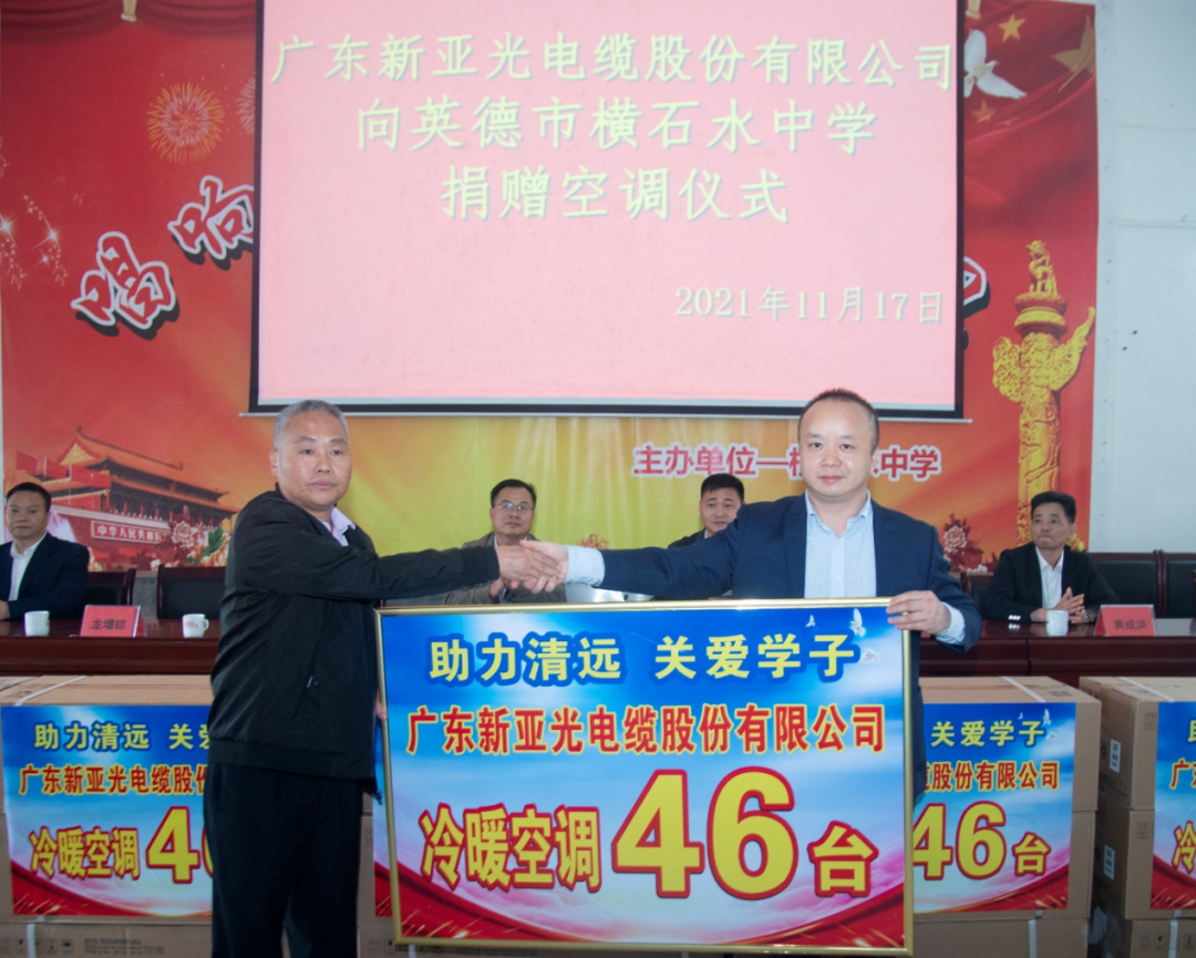 11月17日,我司向英德市橫石水中學捐贈空調儀式在英德市橫石水中學隆重舉行。本次捐贈儀式由清遠市工信局、清遠市慈善總會及我司聯合舉辦。清遠市工信局副局長張本疆,英德市教育局副局長向自剛,英德市橫石水鎮黨委副書記、鎮長范方,我司行政總監盧國飛,橫石水中心學校全體學校師生參加本次儀式。本次愛心活動,我司捐贈冷暖空調46臺。