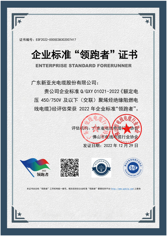 喜訊!新亞電纜入選2022年全國(guó)企業(yè)標(biāo)準(zhǔn)“領(lǐng)跑者”名單