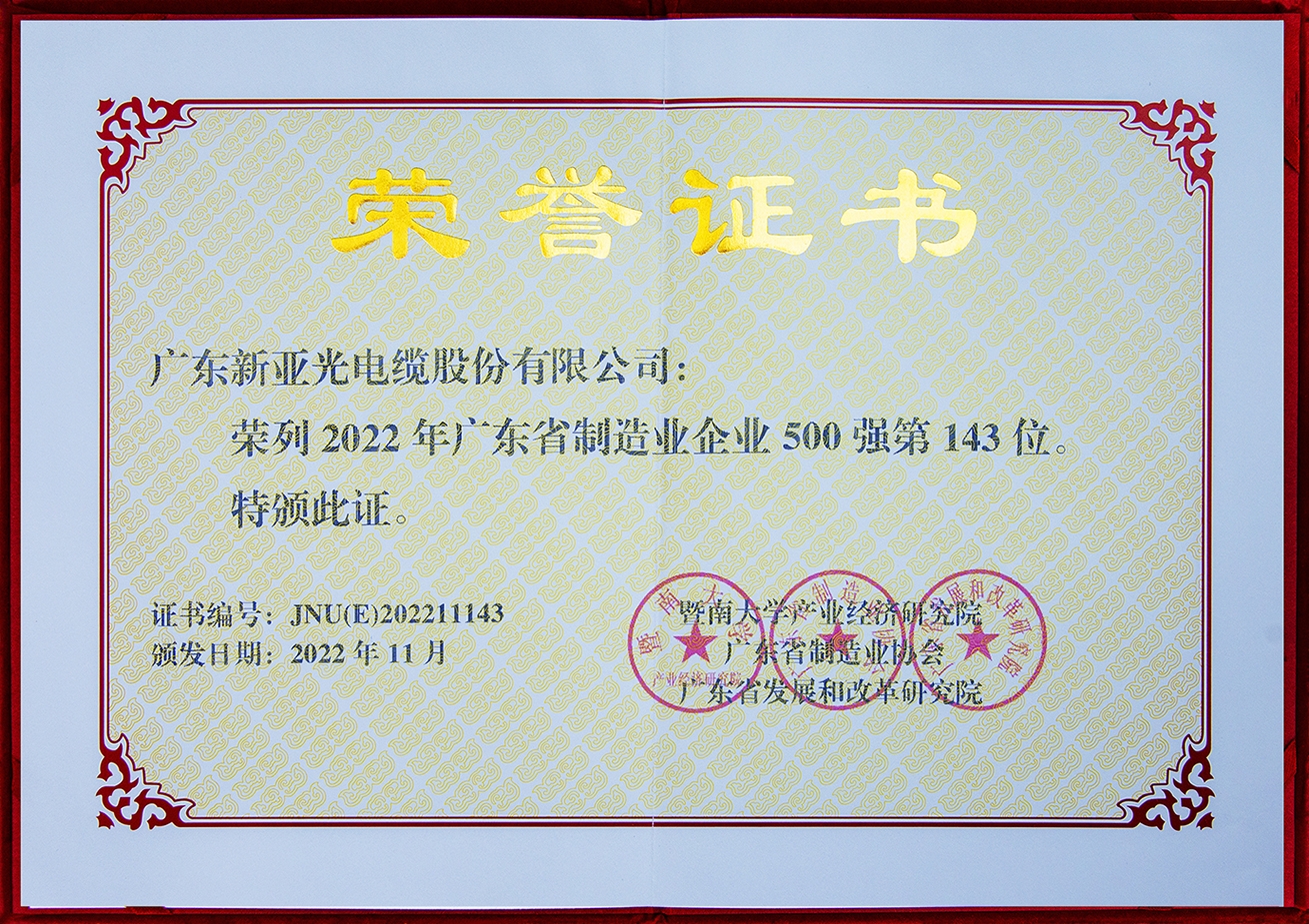 日前,廣東省制造業發展年會暨廣東省制造業500強企業峰會在廣州舉行。廣東新亞光電纜股份有限公司再度入選“2022年廣東省制造業企業500強”排名榜單,位列第143位。