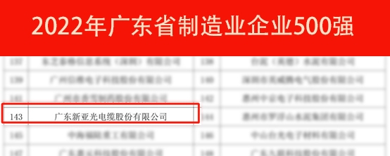 實力登榜!新亞電纜再度上榜“2022年廣東省制造業企業500強”