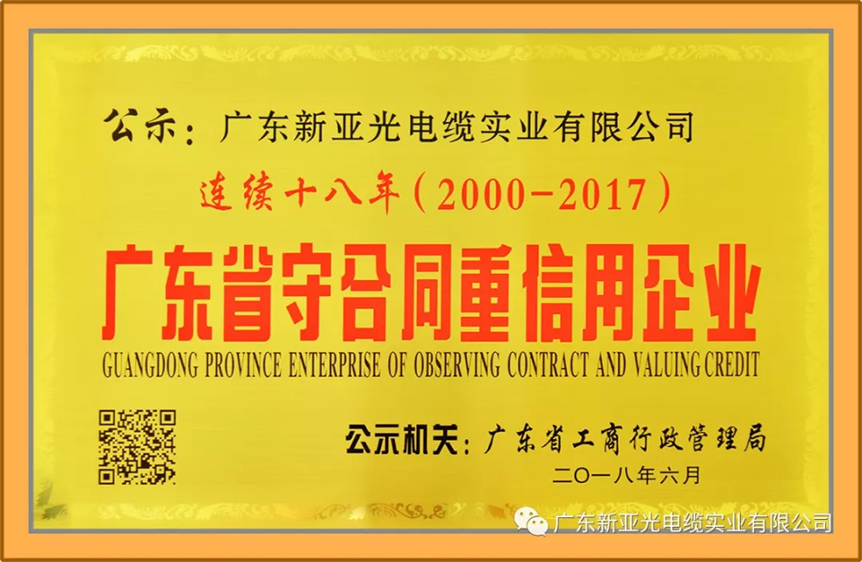 我司自成立以來,始終恪守誠信經營理念,遵循“新亞電纜用心造”的核心價值觀,為社會各界提供優質的電纜產品和服務。此次再度獲得“守合同重信用”稱號,已經是我司從2000-2017連續十八年不間斷獲得此榮譽,不僅讓我司榮譽榜再添一項,更重要的是,我司再一次得到了社會各界的肯定和認可,讓我司的品牌價值再上一個新高度。