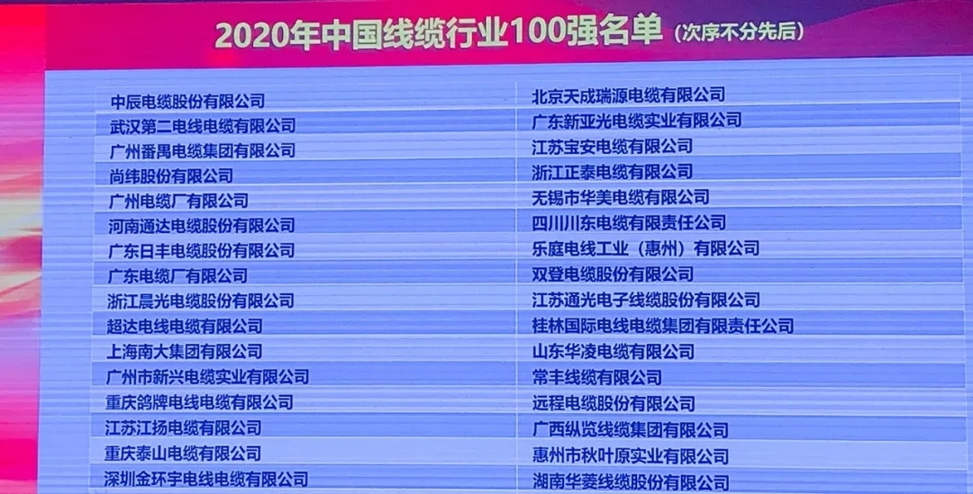大會還發布了2020年中國線纜行業最具競爭力“百強企業”名錄,廣東新亞光電纜實業有限公司光榮入選《2020年中國線纜行業100強》榜單。